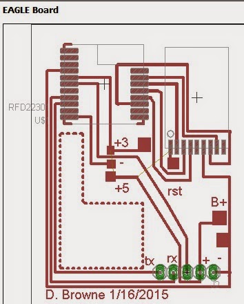 The schematic is missing the 3 volt regulator (Pololu), and the battery for that matter. I just added pads for it into the PCB, I don't spend much time in Eagle, so it's a painful experience. One jumper in this version, from the CC2500 VCC to +3, you'll see the pads in the middle. Also, I've added a 100 micro farad electrolytic capacitor across the +/- leads. The device tends to crash when you plug it into the charger, the Cap reduces this (maybe). Not really a big deal, since all this does is relay what the CC2500 receives to the iPhone.