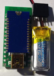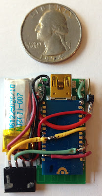This time, I used a small amount of hot glue to put the parts onto a piece of paper, then wired everything point to point. This avoids the added thickness of a PCB. If I do it again, I'll use smaller wires. Also the "dead bugged" WT12 doesn't appear to interfere with the Wixel, which was a happy surprise.